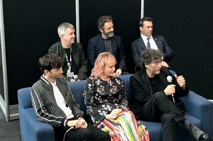 Show runners Neil Gaiman and Douglass Mackinnon appear with Good Omens cast members Michael Sheen, Jon Hamm, David Tennant, and Miranda Richardson at New York Comic-Con 2018. (Image: JJ Goodman)