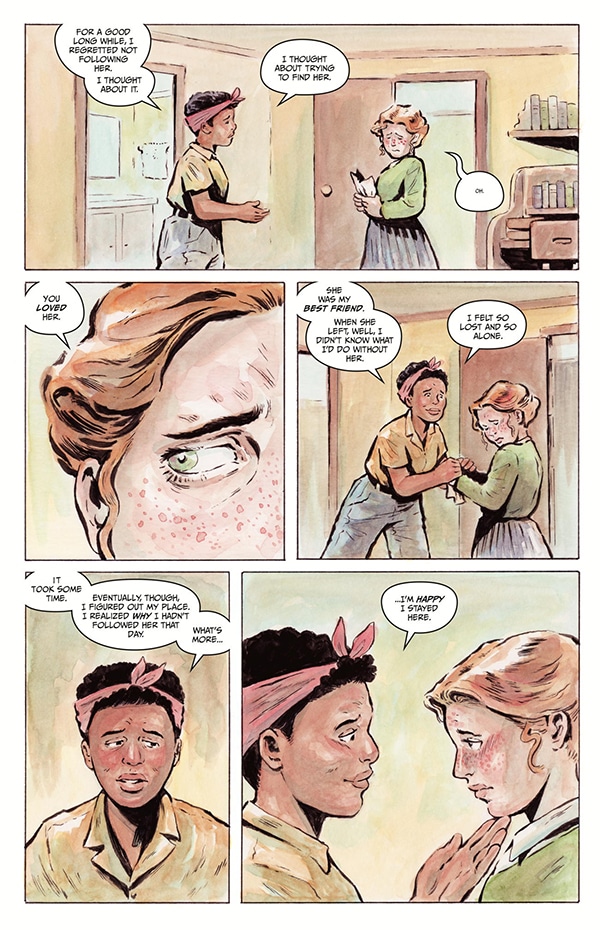 The plot of Tales From Harrow County: Fair Folk #1 seems to take place some number of years after the original Harrow County. This spin-off starts off with the main character from the original comic book, Emmy, leaving town. Only, it’s not from Emmy’s perspective. The spin-off actually takes place from the perspective of Bernice Anderson: Emmy’s best friend. Also love interest, but only on Bernice’s side apparently.