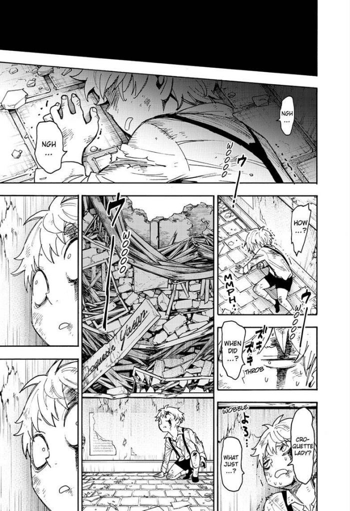 Spy x Family Ch. 62.2 starts us off with young Loid staring at the pillar of smoke coming from the direction of his friend’s clubhouse, which was formerly an army storage depot. Even as he’s wondering what just happened though, he quickly finds out. An artillery shell from presumably the same battery lands in his town’s square right in front of him, throwing young Loid against the croquette shop behind him. He only survives thanks to his military combat helmet (that he’d been wearing for fun, no less), unlike the bystanders in front of him and the poor croquette shop woman. Even as Loid stares in shock at the chaos though, his mother makes it to him and flees with him. Without their father, no less.