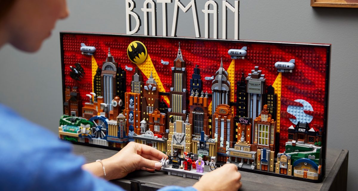This 4,210-piece buildable GOTHAM CITY backdrop measures over 30 in. (76 cm) wide. It incorporates 15 panels that remove to reveal the inside of Wayne Manor, the Batcave™ and Arkham Asylum, and the activities of numerous villains from Batman: The Animated Series. The set also includes 4 minifigures – Batman, The Joker™, Harley Quinn™ and Catwoman™ – and a removable Batmobile™ and Batwing™. The assembled model can be mounted on a wall or stood on a surface using a flip-out stand. The 2 sets of included building instructions allow 2 people to work on the model simultaneously. For added convenience, a digital version of the set’s building instructions can be found on the LEGO Builder app.