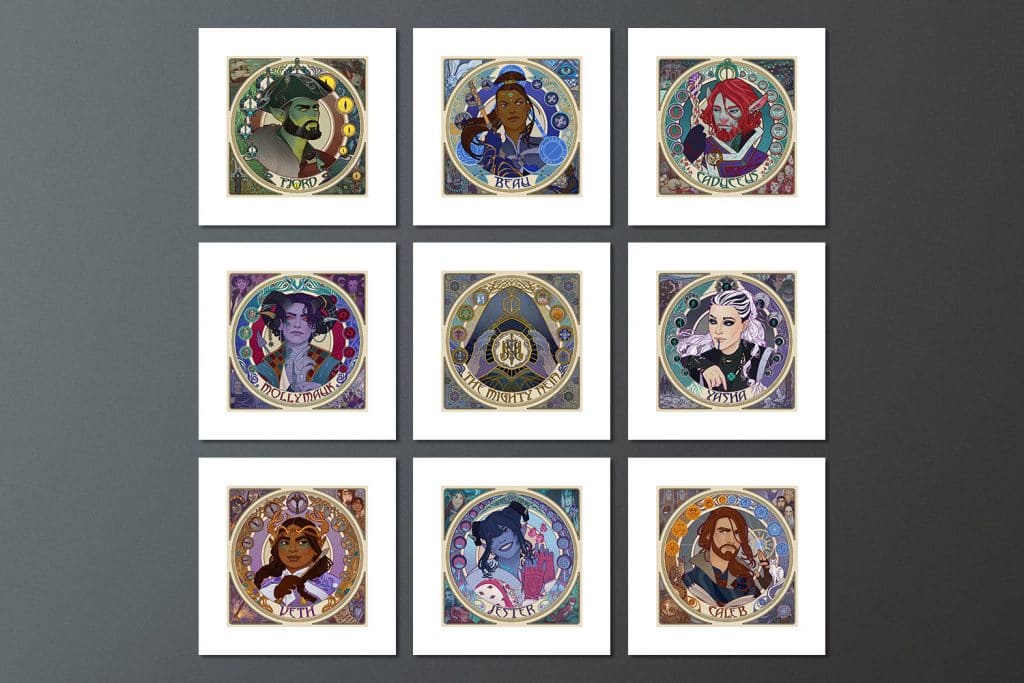 Inspired by Art Nouveau portraiture, Sam Hogg captures the beauty, brilliance, and badassery of the heroes of Critical Role: Campaign 2 in this collectible series. The Mighty Nein Portrait Series (Set of 9) unites eight beloved adventurers and the guiding force of the Hands of Fate in one dazzling collection for Critters who don’t want to split the party! This art print series includes Mighty Nein members Fjord, Beau, Caduceus, Veth, Jester, Caleb, Yasha, and Molly, each in their own spotlight illustration surrounded by symbols and familiar faces representing their journey through Wildemount. Each portrait is packed with detail that will leave you exploring every nook and cranny of Exandria to relive this team’s most memorable moments.
