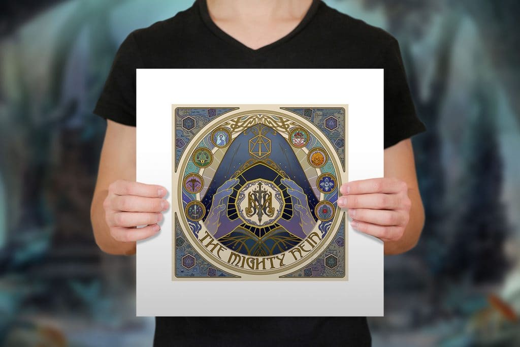 Inspired by Art Nouveau portraiture, Sam Hogg captures the beauty, brilliance, and badassery of the heroes of Critical Role: Campaign 2 in this collectible art series. The Hands of Fate Fine Art Print embodies the driving forces of destiny behind the party’s perilous adventures, celebrating the thrilling highs and lows of life in Wildemount. A mysterious cloaked figure holds the monogram of the Mighty Nein between two celestial hands while surrounded by icons representing each member of the team — their strengths, symbols, and stories bound together inseparably. A map of their travels is overlaid with tumbling dice, the ultimate deciders of fate.