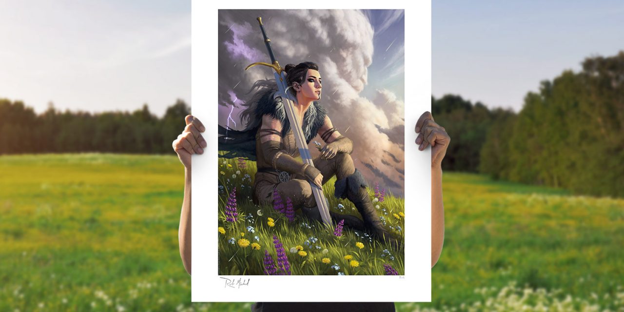 In the calm before the storm, Yasha Nydoorin sits in silence among the flowers with her blue and violet eyes turned towards the sky. She rests against her sword, Magician’s Judge, in a rare respite from the harsh tides of battle. As a follower of the Stormlord, Yasha feels her deity’s unrelenting presence in each drop of rain, each crack of thunder, and each whisper of the wind. And while the furious squall may portend hardship, it also brings rebirth to the fields of Wildemount, nourishing the forget-me-nots and other blossoms that surround the gentle champion.