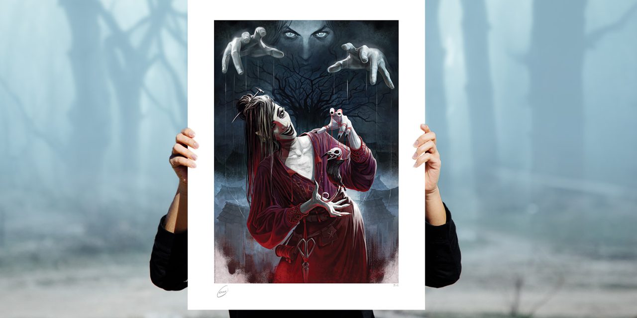At a first glance, the undead one of Bells Hells might appear to be a haunting sight, but Laudna’s actually the bubbliest of the bunch! Yet her tragic past has left her tangled in the threads of fate — namely by the necromancy of Delilah Briarwood. This playful portrait shows Laudna puppeteering Pâté de Rolo, a macabre marionette of her own design. The desiccated Sun Tree casts a lingering shadow over her home of Whitestone, while Delilah’s own machinations are at work in the darkness beyond. From the hanging rope on withered boughs to the tethers of her own unnatural existence, Laudna’s life comes with strings attached.