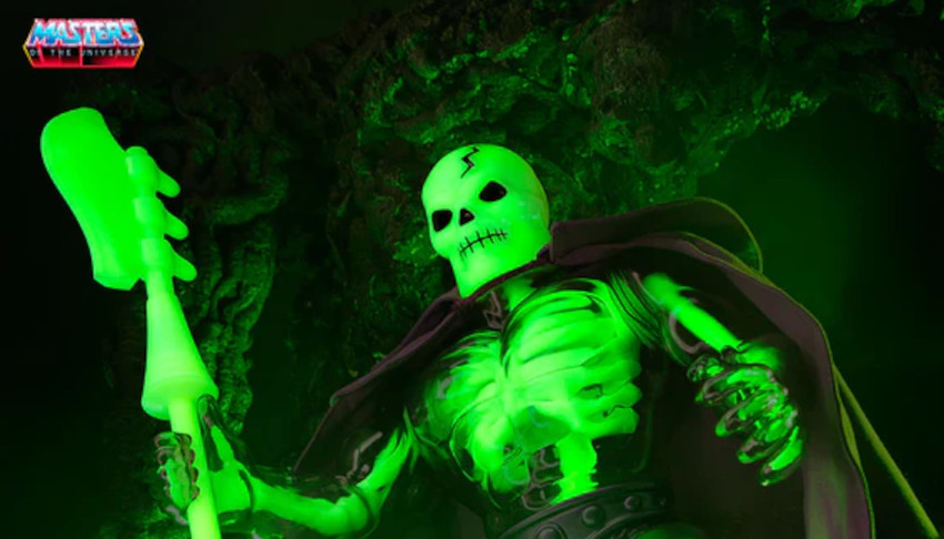 Mondo is proud to present our first ever Masters of the Universe soft vinyl figure – Scareglow! The 15” Scareglow Soft Vinyl Figure features a slush cast outer body with a fully sculpted, glow-in-the-dark skeleton inside. Articulated at the head and arms, Scareglow comes with swappable glow-in-the-dark heads and poleaxes, plus a posable fabric cape with a wired edge.