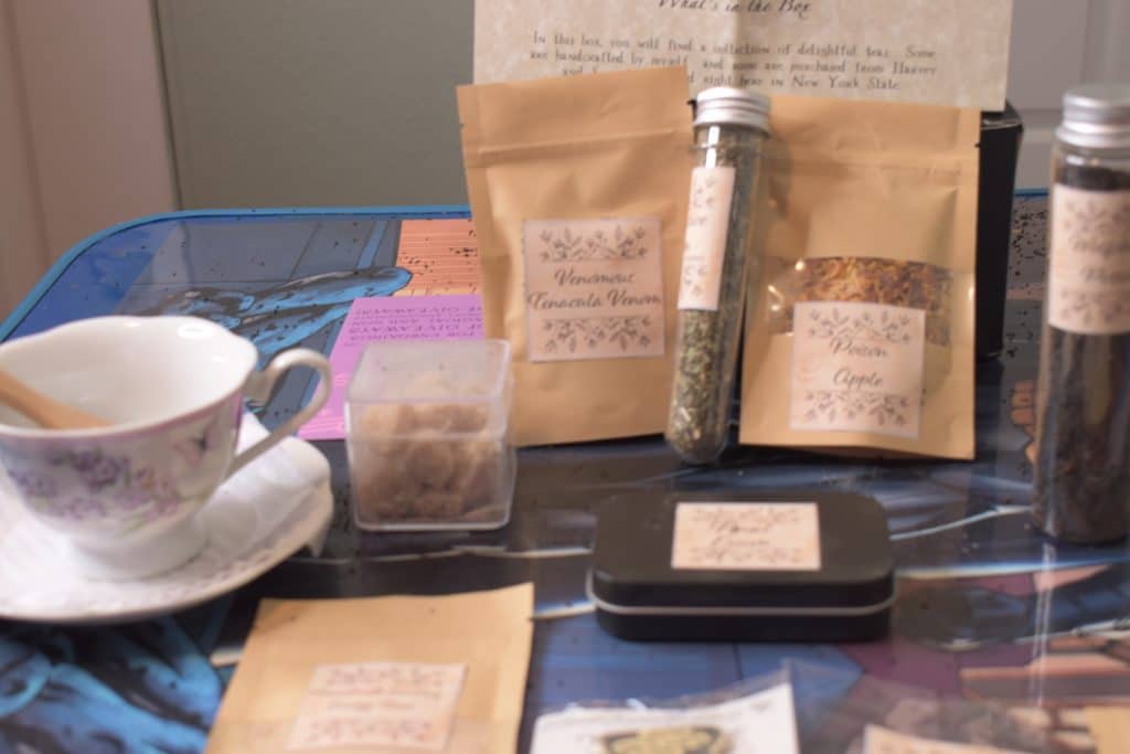 Alchemy For The Skin’s boxes are uniquely made and always come with fun surprises. She adds collectible pins or teacups to them, I have about 3 pins so far. Additionally, each comes with a special scent or theme to correlate with the name of the box. The box we are opening today is full of specialty teas and a very beautiful collectible cup. Let’s dive in to see what is inside.
