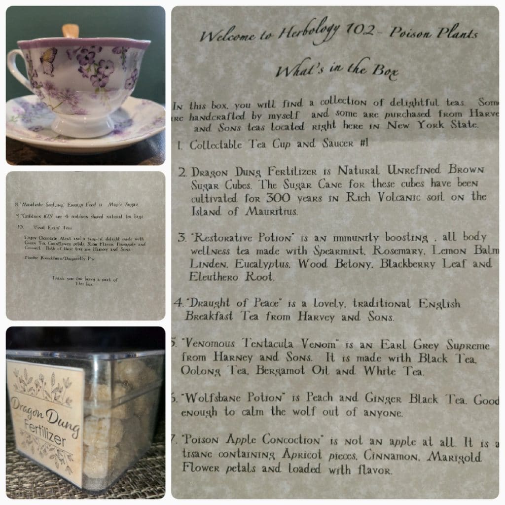 This box is the Herbology 102 Poison Plants Tea Box. As a Hufflepuff, I am loving this title. For those that do not know, the Herbology teacher, Professor Sprout, is the head of Hufflepuff, so I am loving the connection. Inside as I said is a collectible teacup and saucer, some sugar cubes, a collectible pin, and plenty of teas. Down below are more details.