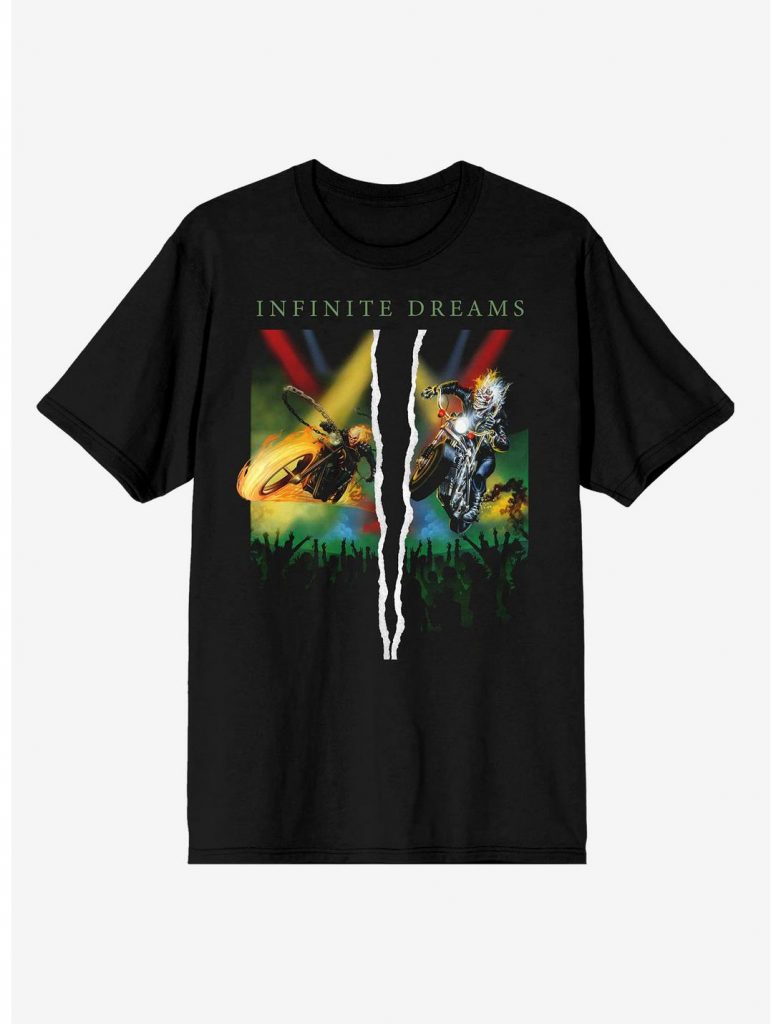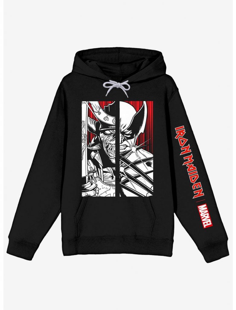 The new line keeps up with the tradition of putting Marvel characters in Iron Maiden artwork. It has Deadpool in the “Stranger in a Strange Land” single artwork, Ghost Rider on the “Infinite Dreams” single artwork, Eddie and Wolverine sharing comic panels, and a sweatshirt with Senjutsu Eddie and Wolverine.