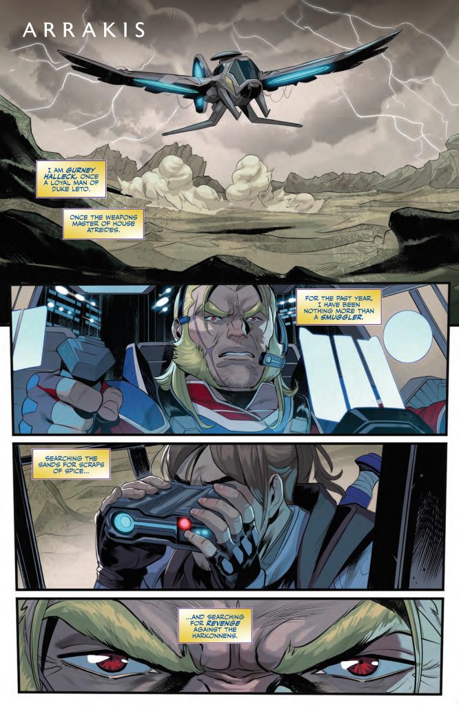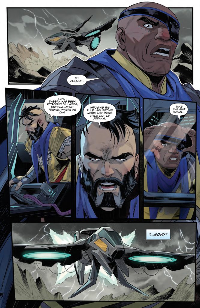 My last complaint is even more minor and a bit petty on my part. I wish the writers and artist had used Denis Villeneuve‘s 2021 version of the ornithopter in this comic book series. Those buzzing dragonfly wings on that insectoid airframe made them look sleek and otherworldly. This version of the ornithopter looks…not bad, but it doesn’t quite evoke the same feeling of coolness. I feel like this is a YMMV moment here, so feel free to disagree with me.