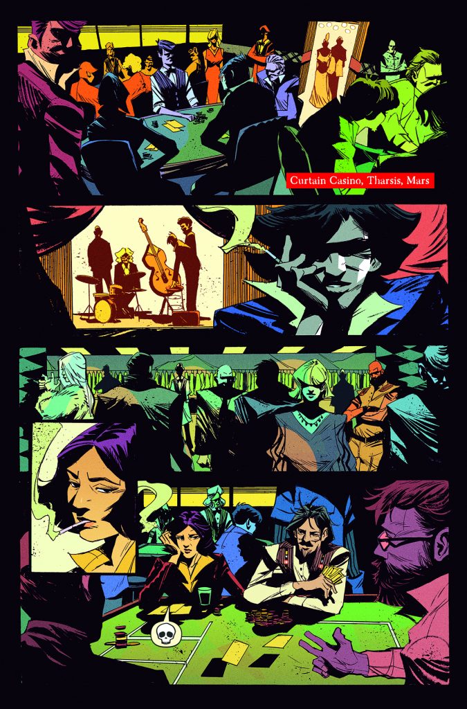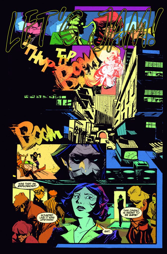 Cowboy Bebop #1 starts us off in a rather seedy-looking casino on Mars, where the Bebop crew are hanging out in. The reason for this quickly becomes apparent when bombs go off in the walls and allow some snappily dressed thugs to get in and hold the customers up at gunpoint. Spike and Jet fight the gunmen and protect the crowd, but Faye notices one of them sneak off in the chaos. Turns out, the whole setup was a cover for that one guy to perform a heist on the casino’s safe upstairs.