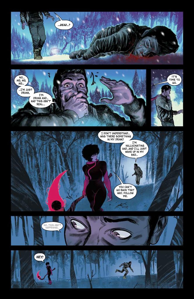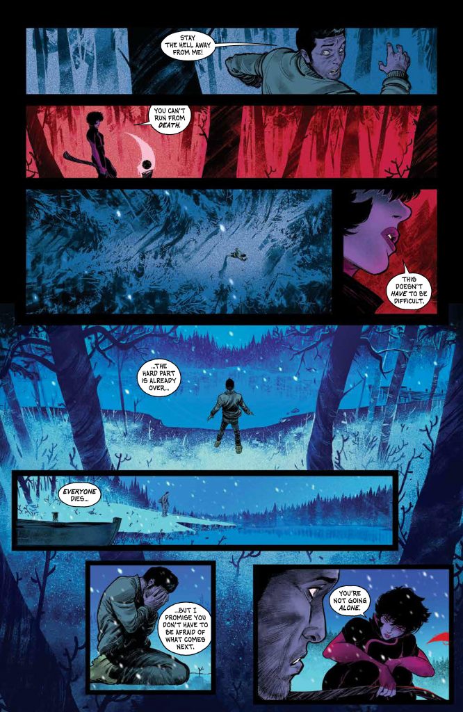 First off, visually, this story has the perfect aesthetic. The base palette is dark, but also full of deep reds, blues, and purples. The brighter colors cut through the darkness in a way that perfectly matches the supernatural feel of the story. It really feels like the pages glow with Jessica’s Reaper powers. You could easily flip through the pages in issue one and get a feel for Grim without reading a word.