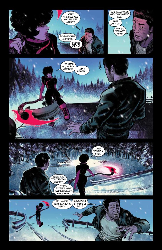 The first issue opens with Jessica arriving at the scene of a car crash to transport a man to the afterlife. It introduces us to the world and Jessica’s job easily, getting the necessary exposition out of the way but keeping things interesting for the audience at the same time. This issue also introduces us to some other Reapers besides Jessica. (I liked that the Reapers all lived different lives at different points in time too. Seems like a fun thing to explore later on.)
