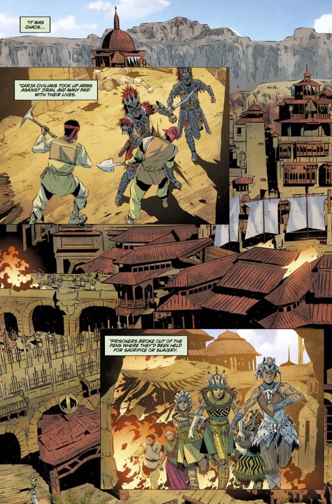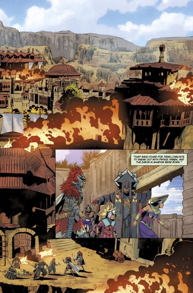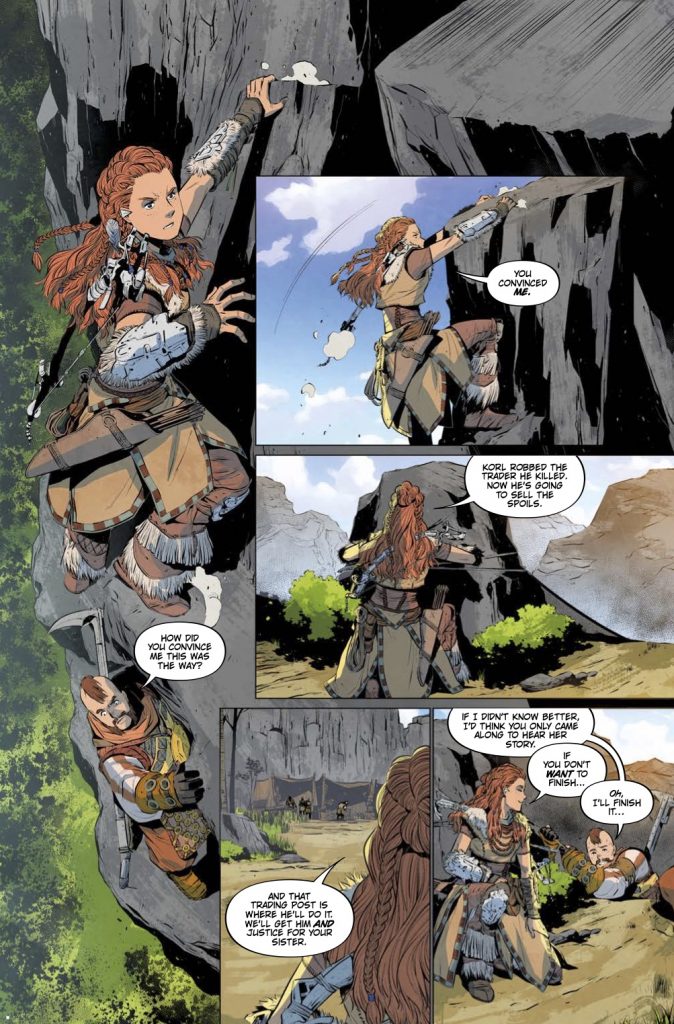I also like the references to Horizon Zero Dawn game in the comic. That bit about how the Shadow Carja escapes with the Sun Queen and Prince Itamen is a nice callback to the game. It’s a very nice touch there that the game fans will appreciate.