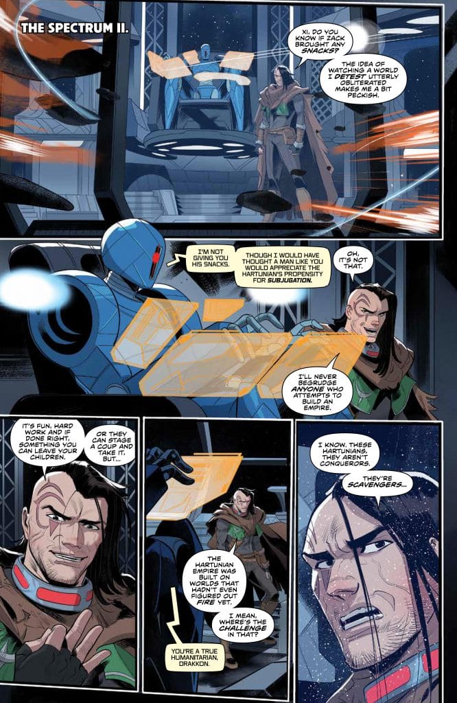 Drakkon smug as ever cracking jokes over the destruction of an entire species. He does have some Thanos-like clarity of how it wouldn’t necessarily be a bad thing to take out a bully of an empire.