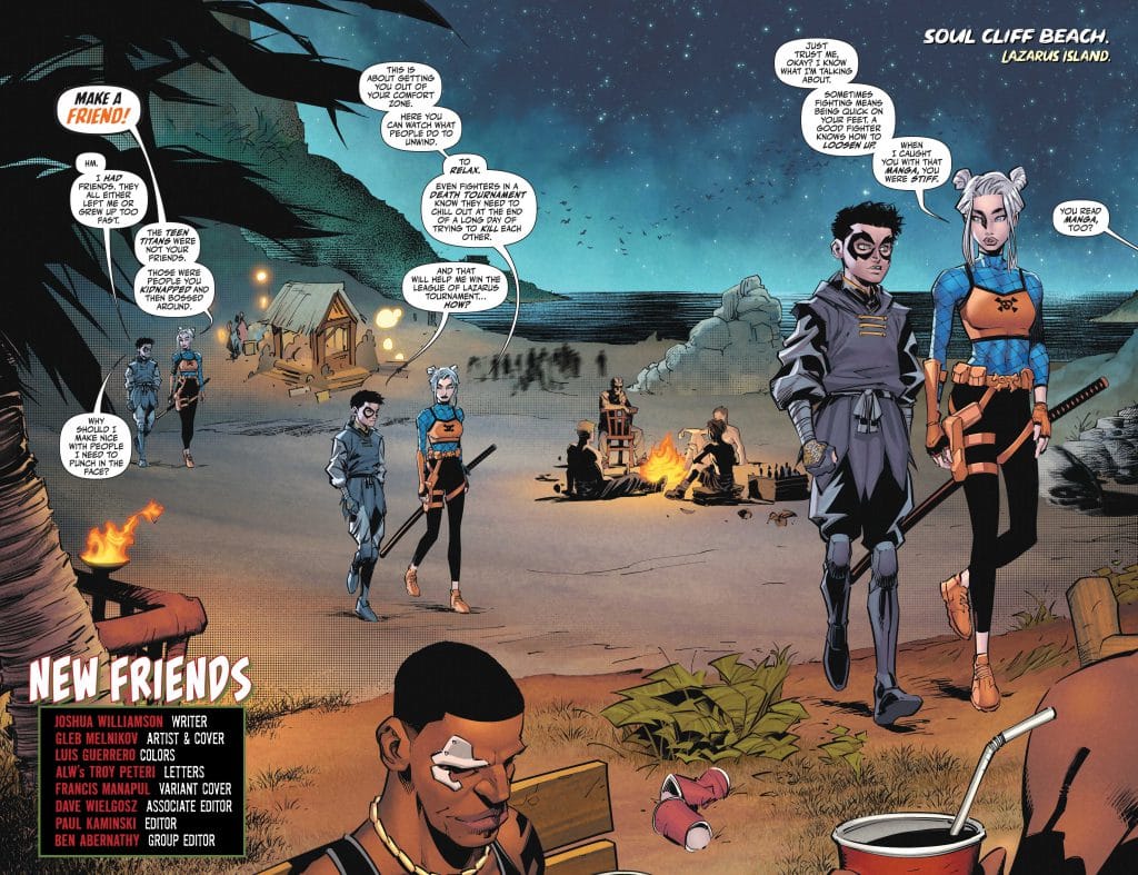 I really like this next scene and it speaks highly of the writers for this title. Damian and Conner are meant to be lethal enemies in this tournament, but after Damian offers to fight, albeit illegally according to the tournament, Conner reaches out in a way. Conner shares with Damian that he, too, is the son of a superhero. The exchange of ‘my father is worse than your father’ something cool happens that I’d bet reverberates in the pages to come. Damian and Conner begin to bond. The fatherly barbs go from each father’s failings to their love of fishnets and leather…lots of leather. They even laugh together.