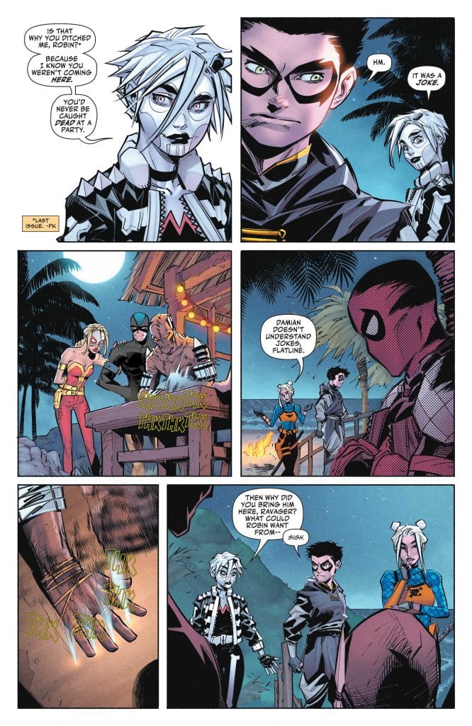 Damien feels he owns this tournament. No one can match his skills, but Ravager tells him he needs to learn more to hope to win. She challenges him to the one mission Damian will struggle with – make a friend. Ravager takes him to a party on the beach. Needless to say things don’t go well and within a few minutes, Robin nearly picks a fight or two. If fighting were not forbidden at night, even Ravager and Flatline couldn’t stop him. Damien then pulls a move that I have to admit was a good move.