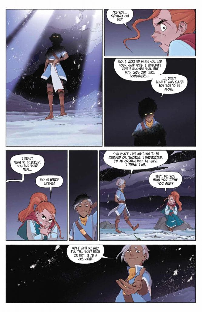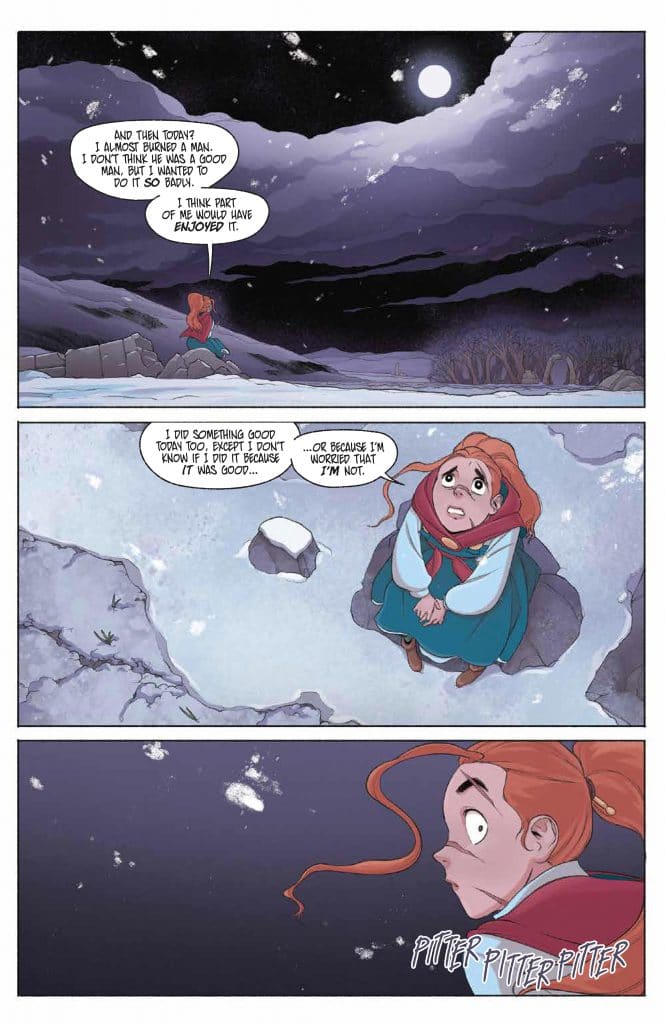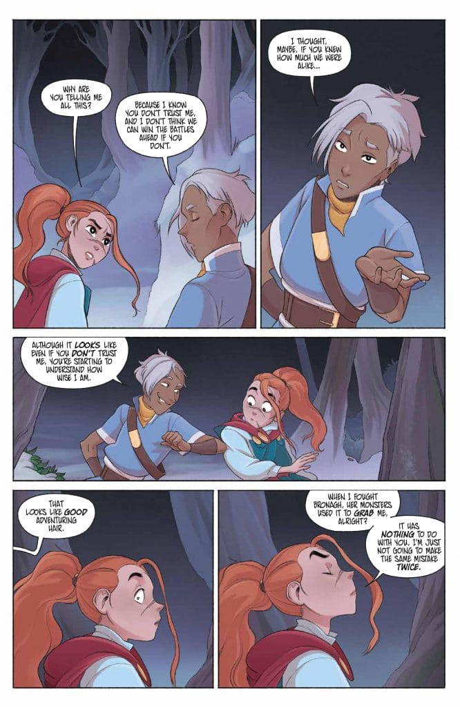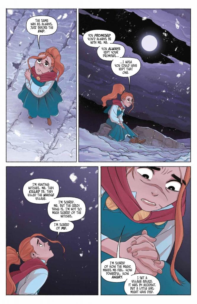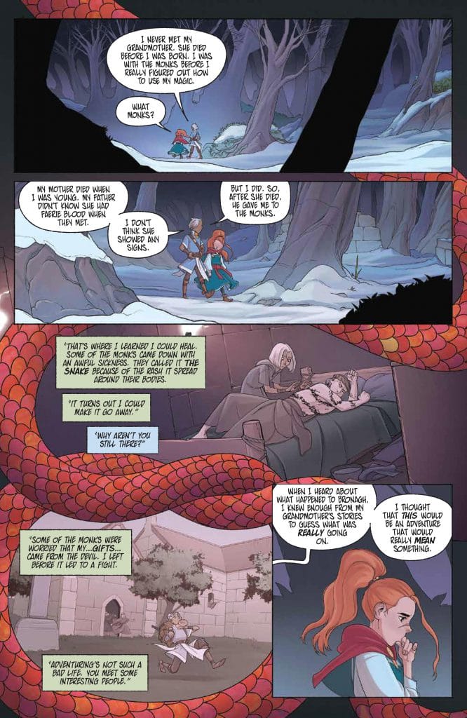 First, we get a lot of extra depth from Saoirse herself. She wields more power than ever before, and uses her abilities in new ways. (So the magical action stays top-notch.) But we also continue to see her emotional vulnerability and the toll using her magic takes. This final issue picks up the earlier thread about Saoirse being afraid of how her powers might hurt people and expands it. We learn she isn’t just afraid of people getting harmed in the crossfire of battle; Saoirse actually worries the power will corrupt her, and make her want to harm others. Her caution and self-awareness when it comes to magic only endears her to us more.