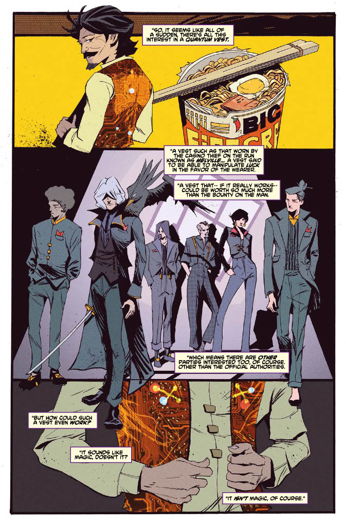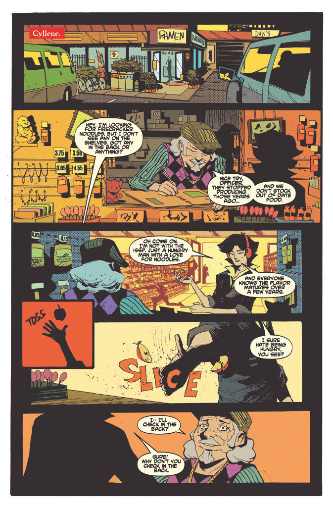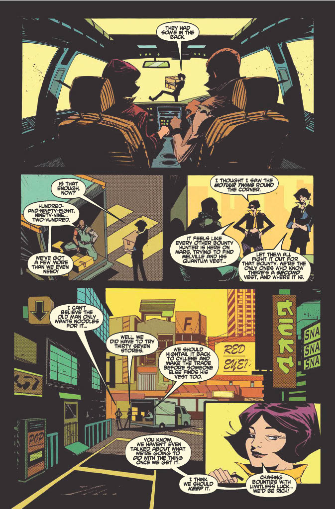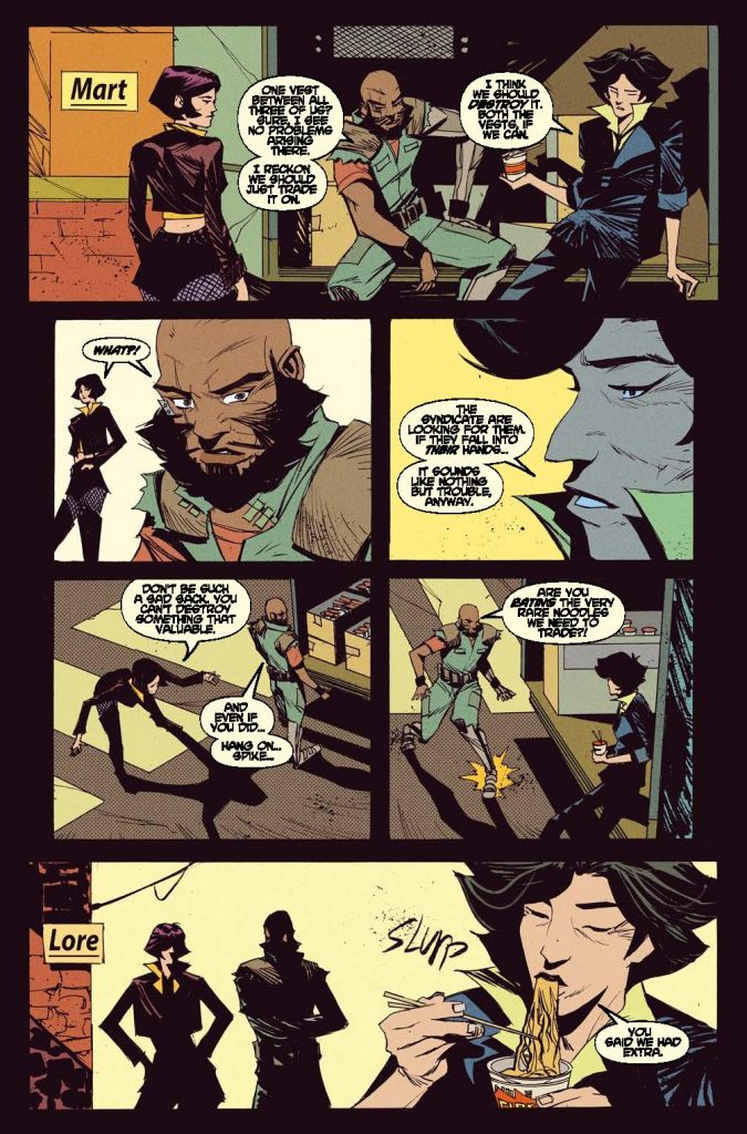 Same goes for the characters of Cowboy Bebop #3. There was just something right about Spike Spiegel sitting down to a nice lunch of Firecracker Noodles. You know, the very rare noodles they have to deliver to the nutty professor? Along with Faye shooting down a ship with her pistol, and Jet having to bail everyone out, only for Spike to accidentally mess it all up. The characterization just feels spot-on for this issue, and I love it.