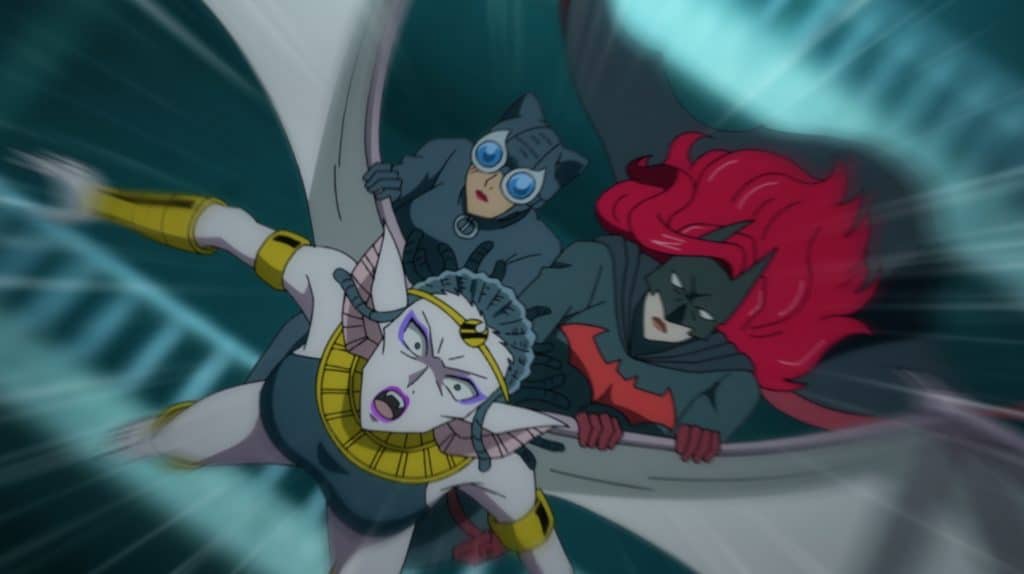 If the good guys can have a bat, then why not the baddies? To counter a face-off with Catwoman and Batwoman, Cheshire summons Nosferata to join the fray. And at one point, the best Catwoman and Batwoman can do is go along for the ride. Zehra Fazal (Young Justice franchise) provides the voice of Nosferata, while Elizabeth Gillies (Dynasty, Sex & Drugs & Rock & Roll, Vacation) and Stephanie Beatriz (Brooklyn Nine-Nine, In The Heights, Encanto) provide the voices of Catwoman and Batwoman, respectively.