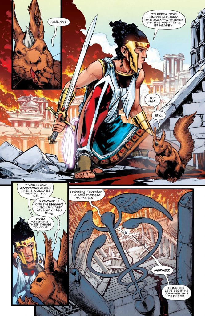 I missed last issue, but it appears Diana’s time in Asgard came to an end. She once again strolls the streets of Olympus with her new friend. Apparently, Ratatosk the squirrel followed Diana from Asgard and has become attached to her journey. The reunion fails Diana’s hopes when she finds it completely empty. The city burns and lays in ruins with its protectors and resident gods nowhere to be found. How could someone not only wipe out Olympus but the entire group of gods?