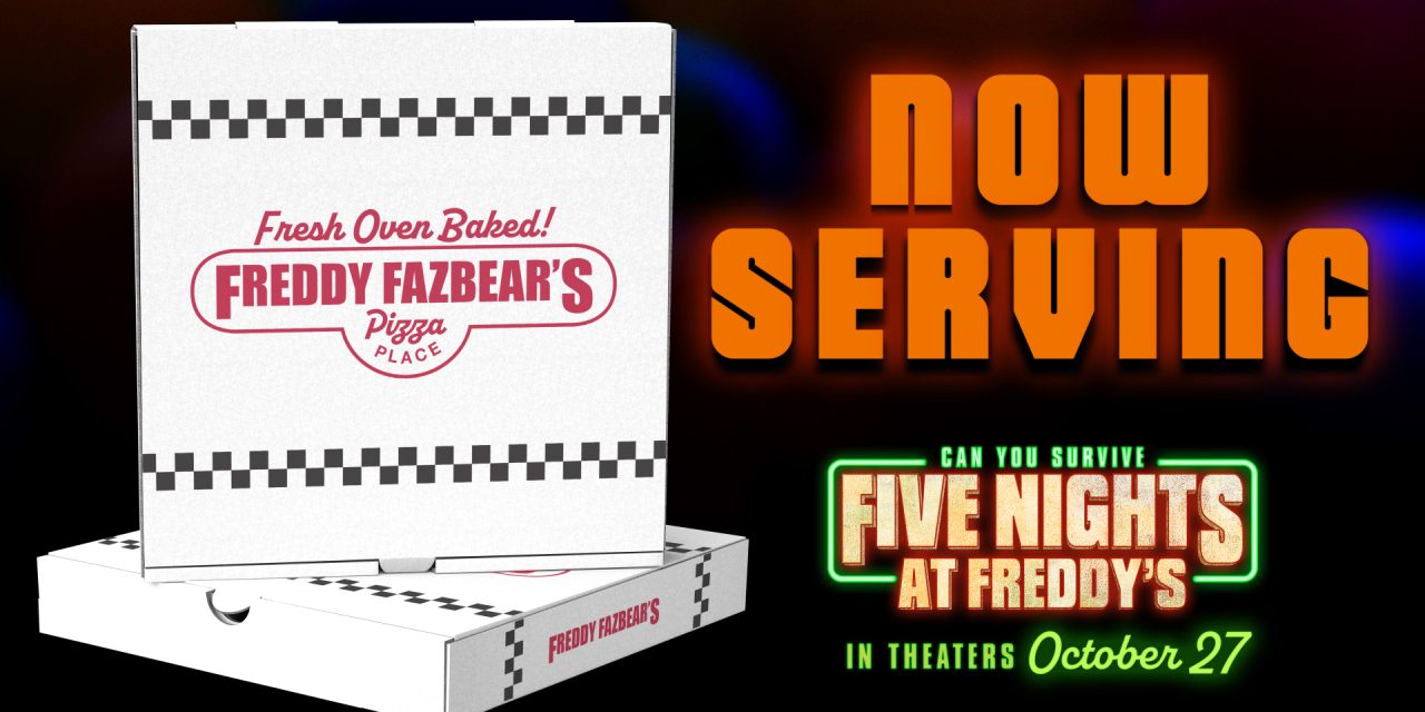 NBCUniversal is proud to announce that they will be hyping up the theater experience for Five Nights at Freddy’s with special promotional merchandise. Specifically: pizza boxes. Even more specifically: pizza boxes bearing the logo of the fictional Freddy Fazbear’s Pizza Place at any participating theater. With your pizza of choice within it, of course.