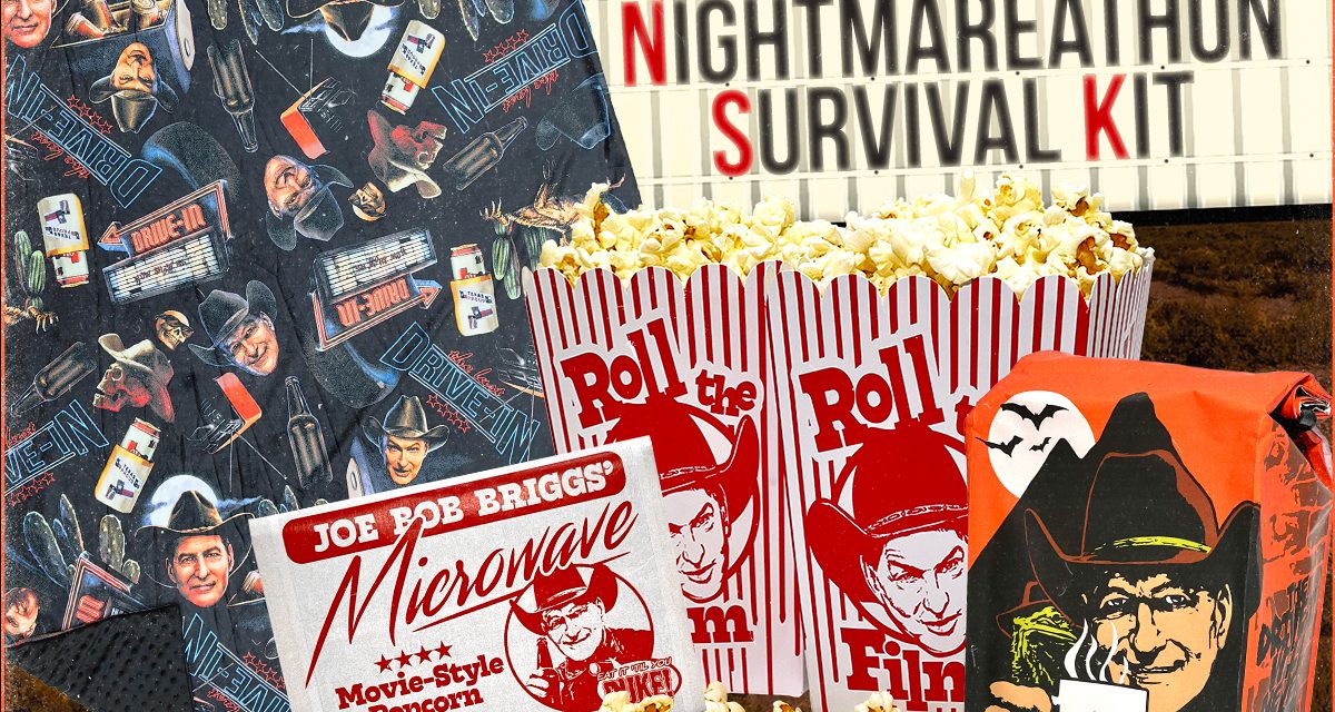 The Last Drive-In with Joe Bob Briggs is hitting the end of their supercharged sixth season with a six-movie marathon dubbed the Nightmareathon. It’s a dusk-till-dawn marathon celebrating six years on Shudder with six mystery movies. To help ring in the marathon, Fright Rags is partnering with The Last Drive-In for an exclusive Nightmareathon Survival Kit. The new kit contains a Last Drive-In throw blanket, Joe Bob’s Mutant Mud coffee, two custom popcorn buckets, and move-style microwave popcorn. It comes in at $75. The package joins Fright Rags’ growing line of Joe Bob collectibles starting August 9th at 10am ET. If you order quickly, it will arrive in time for the Nightmareathon stream on Shudder and AMC+ on August 30th.