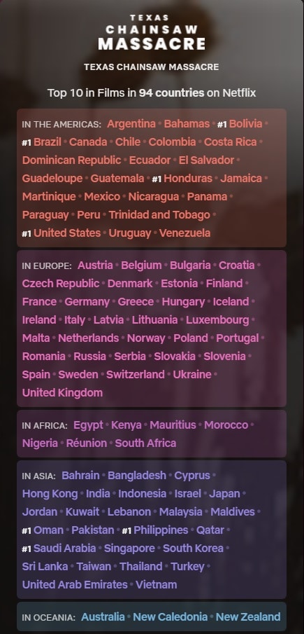 Texas Chainsaw Massacre ranked in the top 10 in 94 different countries and hit #1 in the US, Bolivia, Brazil, Honduras, Oman, Phillippines, and Saudi Arabia.