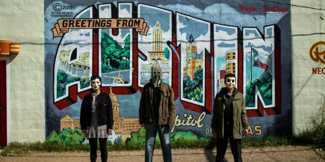 The Strangers stopped by several Austin hotspots, including the “Greetings from Austin” mural, The Glass Coffin, The Museum of the Weird, and The Driskill, as part of a promotion for The Strangers: Chapter 1.