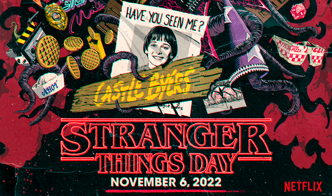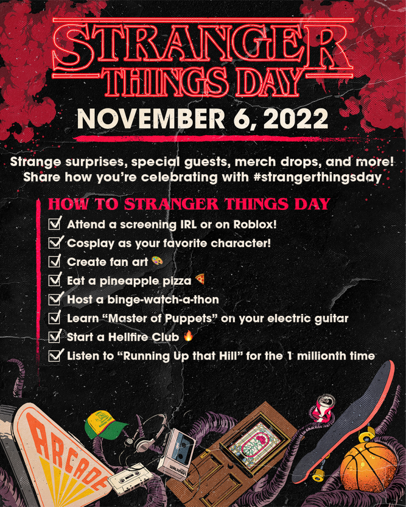 Screenings: For this year’s Stranger Things Day, theaters across North America are hosting screenings of Volume 2 of Season 4 on Sunday, Nov. 6, 2022. Every screening will have trivia, giveaways and other surprises for superfans. They will be held in cities including Los Angeles, New York, Miami, Atlanta, Houston, Dallas, Philadelphia, Chicago, Phoenix, San Francisco, Austin, Texas, Denver, Detroit, Cleveland, Washington, DC, Seattle, Las Vegas, Jacksonville, Florida, and Toronto. Get your tickets now at StrangerThingsDayScreenings.com!