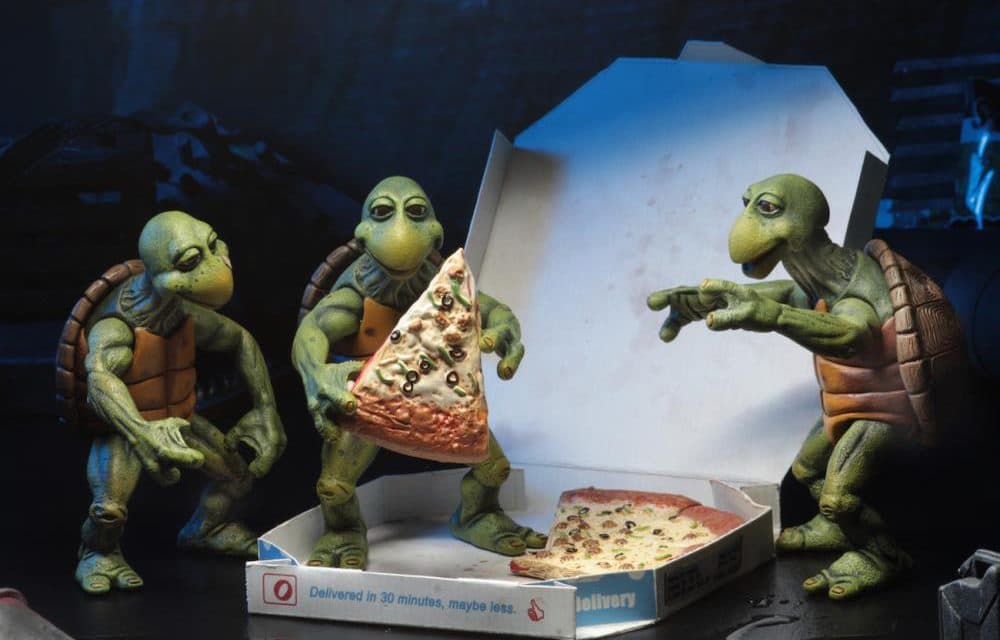 The set includes 4x Baby Turtles, pizza box, 4 slices of pizza, and bag of corn chips, plus a cool bonus-nunchuks and alternate nunchuk-spinning hand for the 1:4 Scale Michelangelo Action Figure (sold separately). The Teenage Mutant Ninja Turtles Movie Baby Turtles 1:4 Scale Action Figure 4-Pack comes in window box packaging, Ages 14 and up.