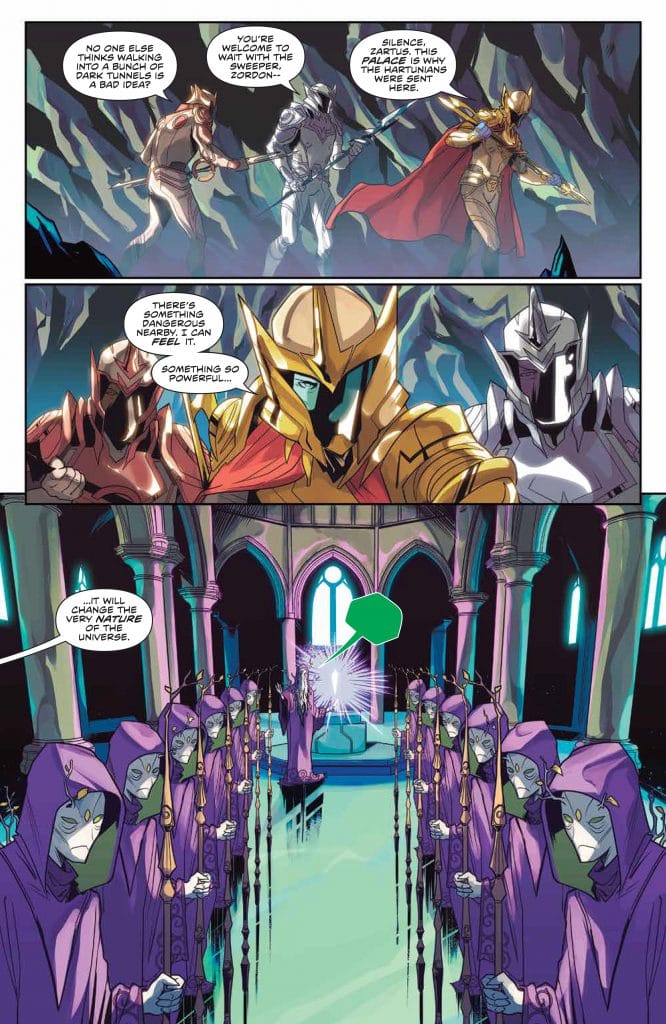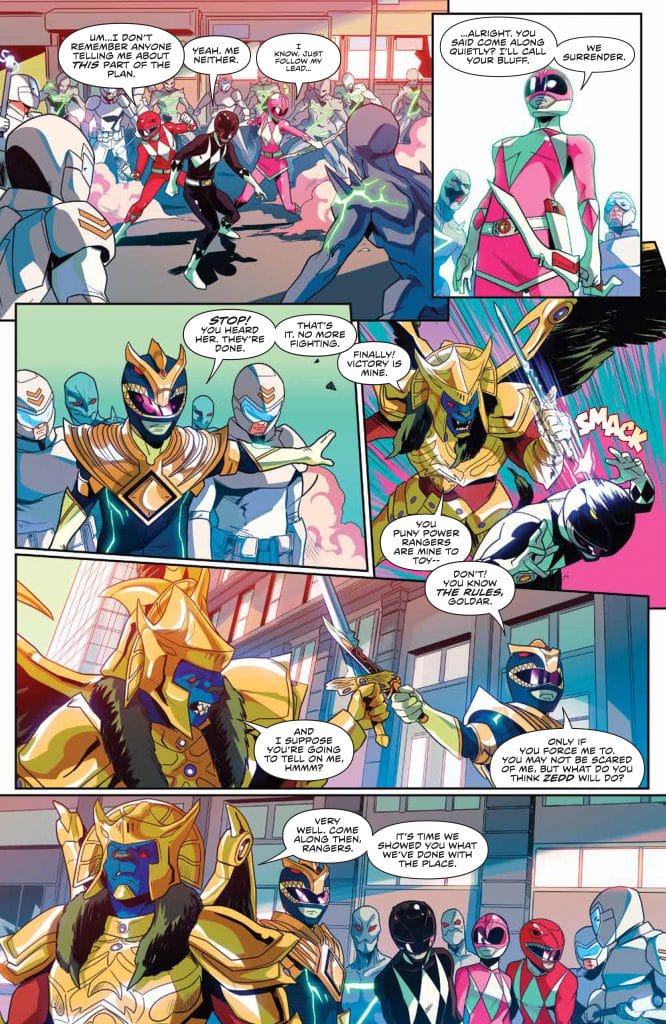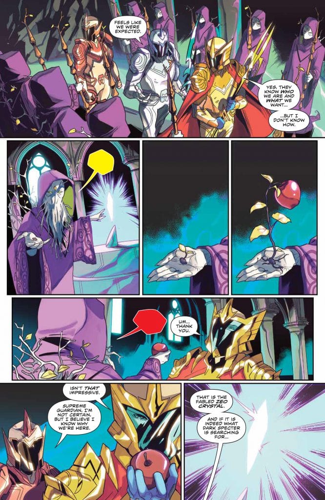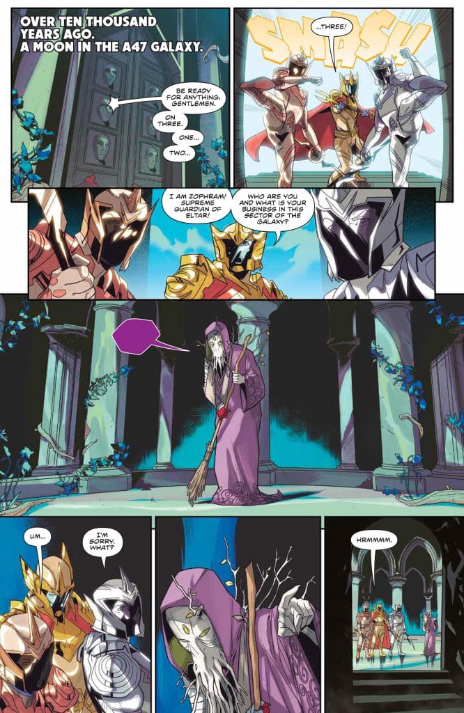 This issue had great pacing! It juggled around 4 different plot lines smoothly! The reveal that Zordon found the Zeo Crystal 100 years ago, must have something to do with the reason Zedd wants him now. I also have been enjoying the fact that Zordon has a sense of humor that he’s not just a stalwart head in the tube. I wish that the rangers could get equal time with the fun side of Zordon but that would take away from what needs to happen outside the Command Center.
