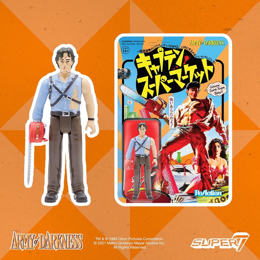 You may know the film as Army of Darkness, but in Japan, it was called Captain Supermarket! Our Super7 Spectacular Kinda Sorta Still at Home-ic-Con Ash ReAction figure is packaged on a cardback inspired by the incredible Japanese Captain Supermarket movie poster!