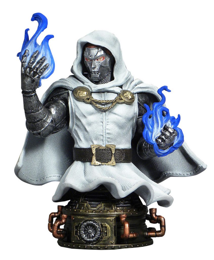 A Diamond Select Toys release! Call him Doom! Wearing his white robes as seen in the hit Marvel crossover Secret Wars, this approximately 6-inch mini-bust of Doom wields translucent blue energy as he prepares to cast a spell, or perhaps unleash a blast from his high-tech gauntlets. This bust of the Fantastic Four foe is limited to only 1000 pieces, and comes packaged with a certificate of authenticity in a full-color box. Designed by Nelson Asencio, sculpted by Juan Pitluk!