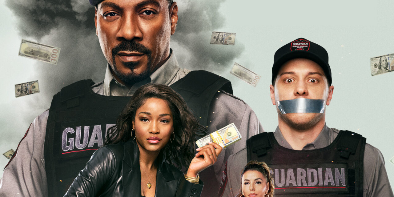 Eddie Murphy sits in the background stoically in his guardian security officer uniform. Davidson stands next to him a little sized-down. There’s some tape on his mouth because, Pete was always going to be a bit of comic relief here. The Pickup’s leading ladies are in the foreground. Keke Palmer sits on top of a literal pile of money. Longoria stands just above an armored truck too. It’s definitely pros vs cons in the new Prime Video movie. Amazon MGM Studios is excited to debut this fusion of old-school buddy comedy and fresh energy.