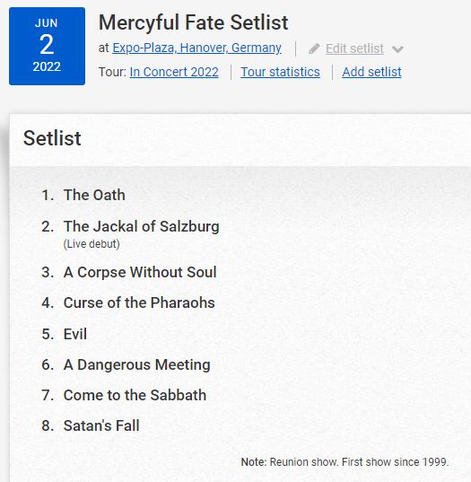 It’s been a long time coming for Mercyful Fate. The last time they played live together was in 1999. It was previously announced that they would have a reunion tour starting in 2020, but the COVID-19 pandemic pushed that back to now. Thanks to our friends at Setlist.fm, we have the setlist they played in Hanover, Germany.