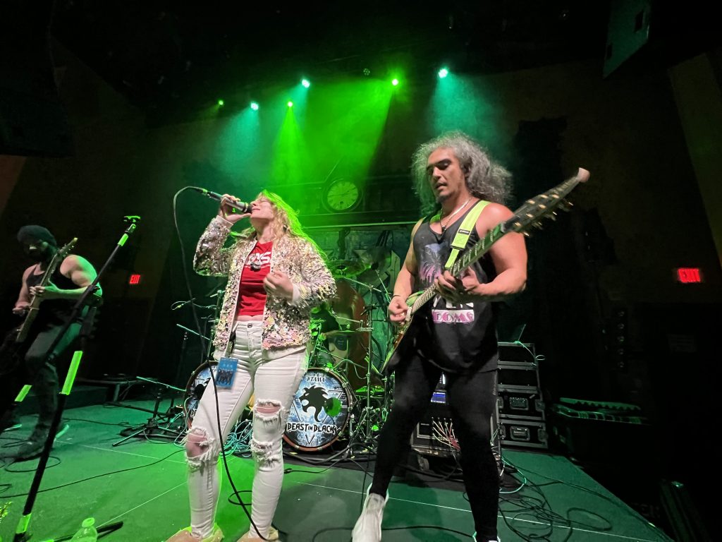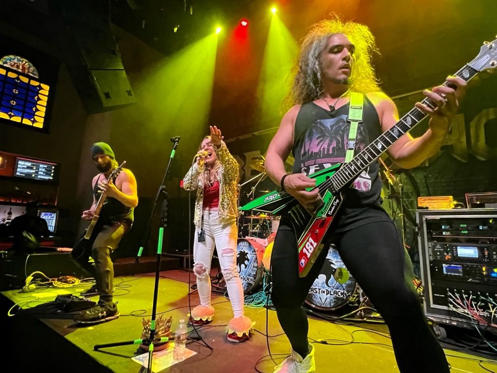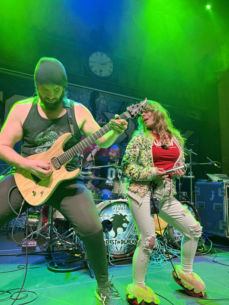 I had never listened to any of Seven Kingdoms’ music before last night. Holy hell, they were fantastic. Taking a look at their stage show, besides the giant cheeseburgers on the drum kit and on vocalist Sabrina Valentine‘s feet, the band doesn’t have a bass player. They have a new album titled Zenith that came out this year, which highlighted their set with three songs: “Chasing The Mirage”, “Diamond Handed”, and “Universal Terrestrial”. They weren’t missing that bass player with guitarists Camden Cruz and Kevin Byrd shredding away on heavy tracks. Valentine and drummer Keith Byrd were real highlights among a great nine-song set. Valentine’s voice showed a range and power not seen in many vocalists these days.