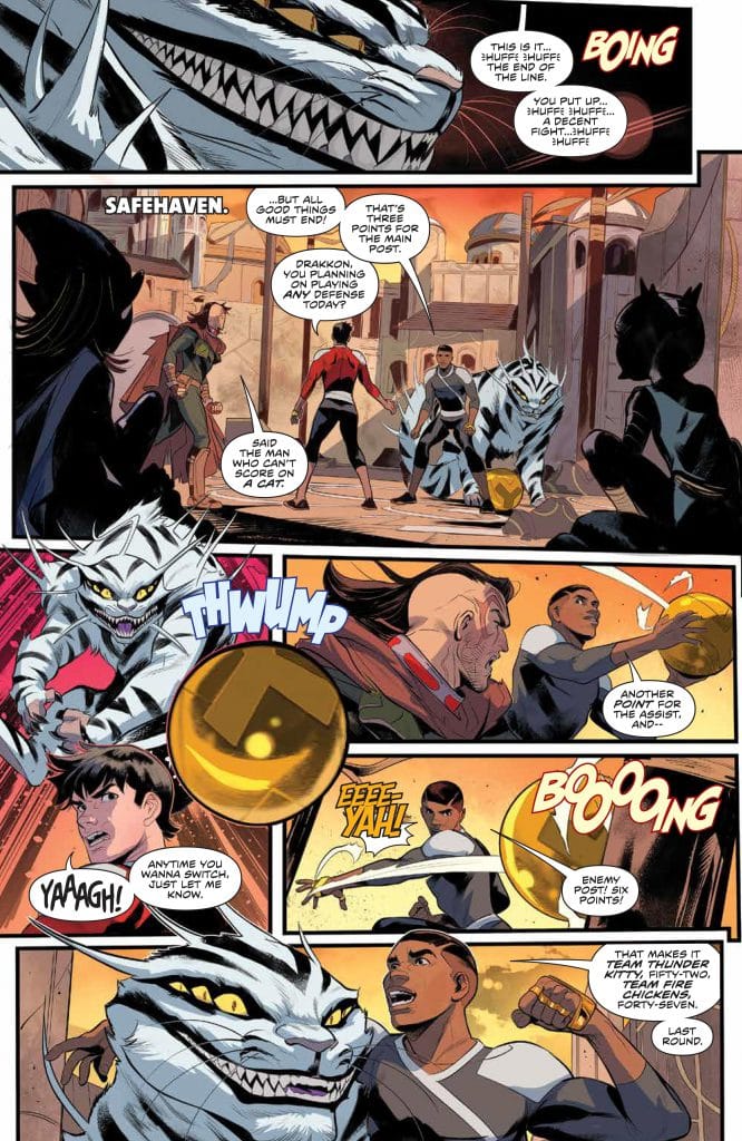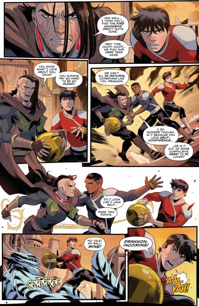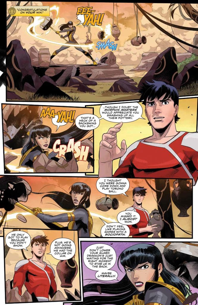 Xi was able to track down the next target of the Empyreals the planet of Hartunia. If that sounds familiar we just ran into some Harutians in the last issue of Mighty Morphin #7 in Zordon’s flashback. Trini ran some theories and said that the zords might be able to do some real damage. Zack even suggests trying to recruit a new Blue Omega Ranger. Drakkon interjects saying “Blue not his color.”