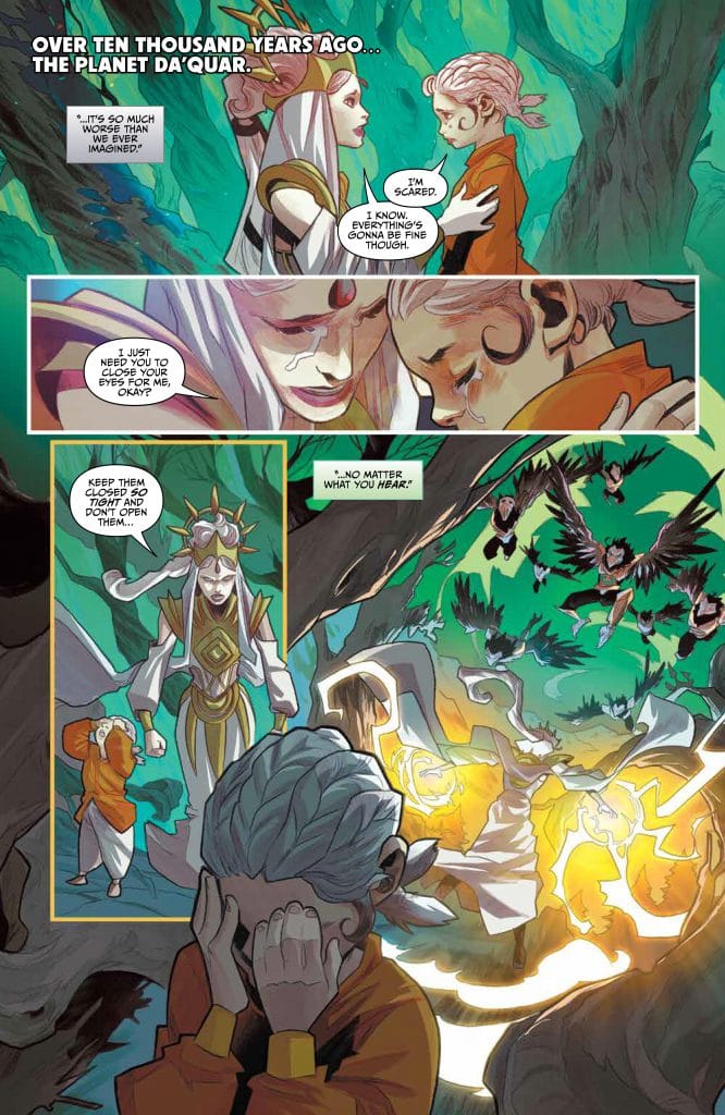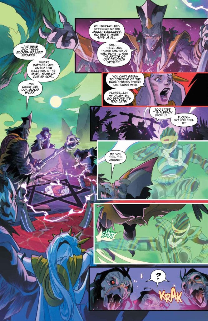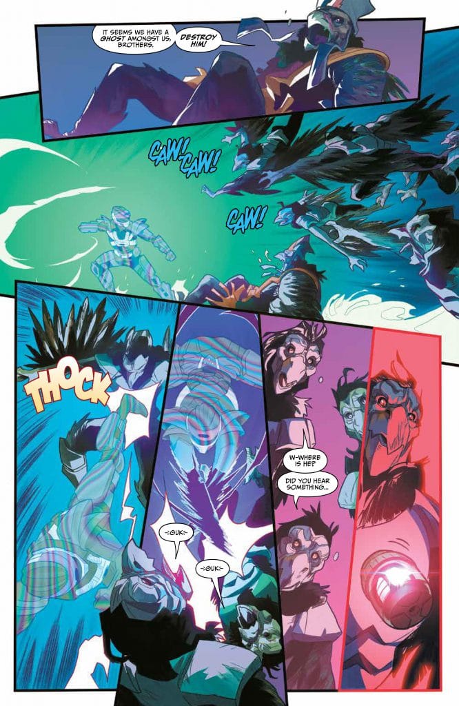 The visuals are epic! Choosing to have large panels and the choice of background colors really give texture to the pages. Speaking of texture you gotta love the fact that even in his stealth mode the choice of giving the Phantom Ranger that rainbow effect was a smart choice! Cheers to making the nod to Mystic Mother! Let’s also applaud them for weaving this into the ongoing story with the current POWER RANGERS stories.