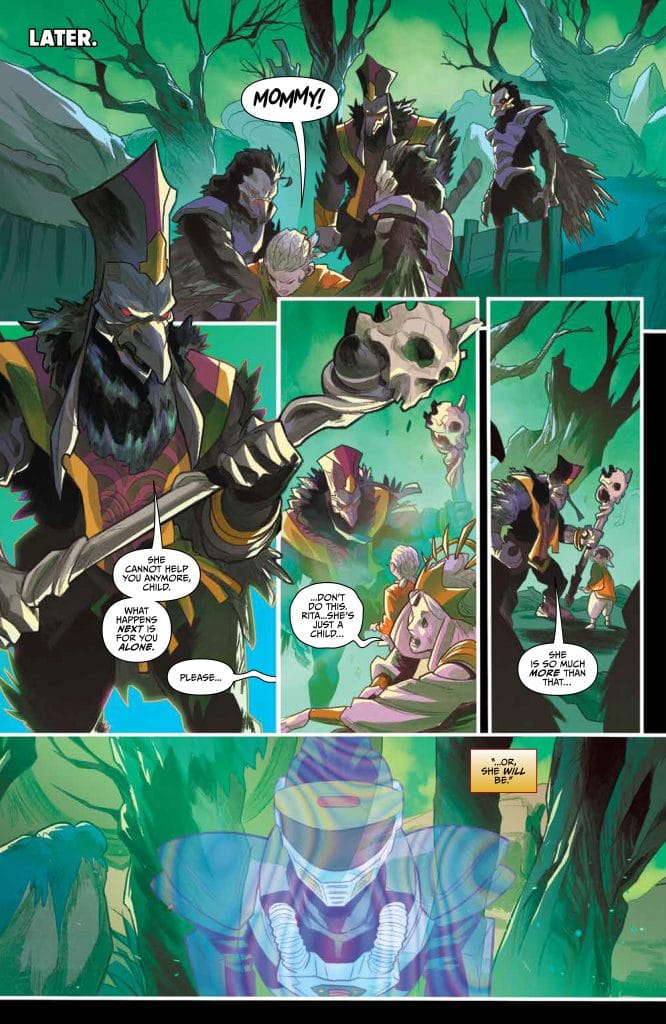 On the flip side to the power coin. We find out on page 3 that the kid is Rita. It was easy to put it together and jump to conclusions. Whereas we waited till page 22 to find out that Master Vile / Eldin really IS Rita’s dad. It would have held a bit more gravitas if it was dropped later in the book.