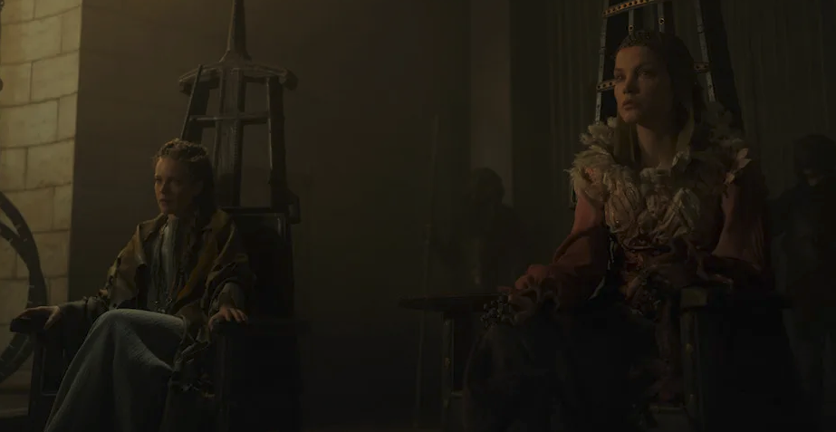 It’s 256 days after the Battle of Greenhill Gap and the death of Edo at the hands of Baba Voss. The Travantian army is in tatters. As we have come to expect with the show, the episode opens with an epic fight sequence as Wren and her battalion struggle to survive the attacks of the Ganites. Cut to the kingdom of Pennsa where Sibeth (still a prisoner) is giving birth to the child fathered by Queen Maghra and Baba Voss’s son Kofun. Haniwa is angry at Maghra for Baba Voss leaving and fighting to make the religious zealots understand that sighted people aren’t evil. Queen Maghra struggles with the decision to hand over her sister to the Travantians, as part of their peace treaty and Harlan is as charming and quippy as always.