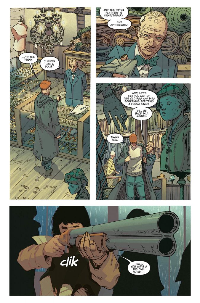 Meanwhile, the missing eye turns out to be necessary for Yotun and a group of his cronies. They use that severed eye to get into an airship full of the Los Angeles’s rich elite. They hijack the airship, use it to destroy the seawall, and then kills everyone in it. Why? Revolution, of course. And so ends Blade Runner 2029 Vol. 1: Reunion. To find out what happens next, read the Blade Runner 2029 #5.