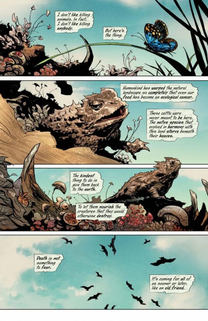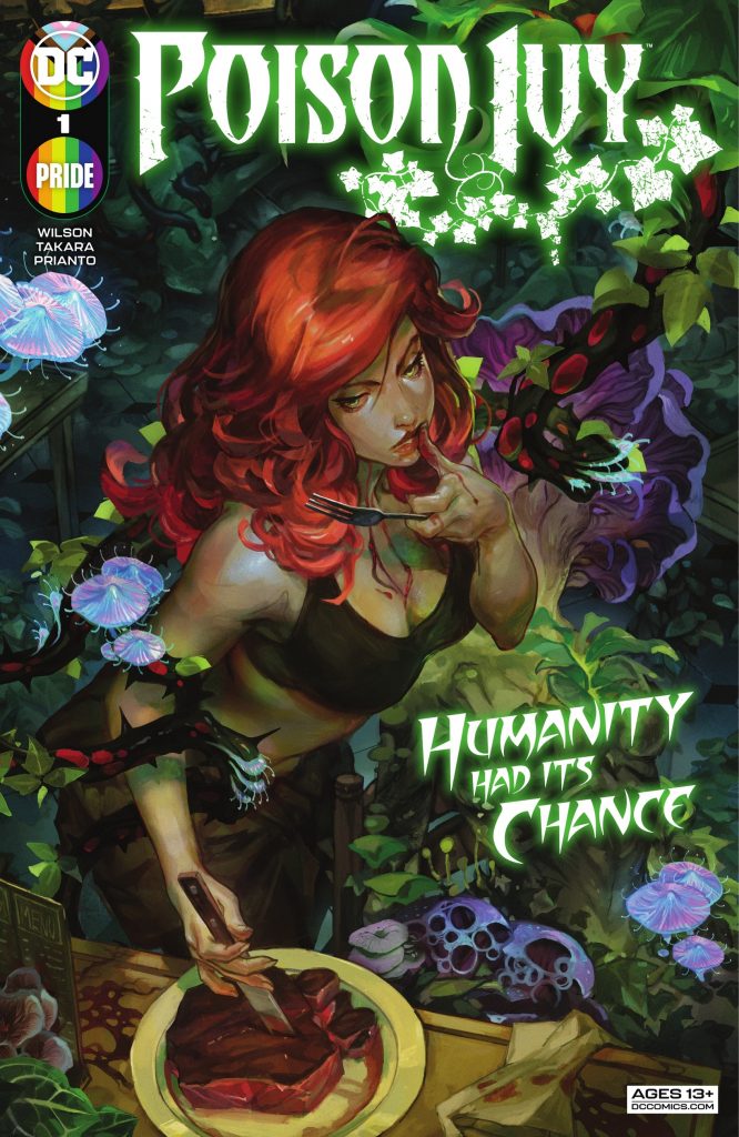 Wow! Where to start with the first issue of this series. The creative team of Wilson and Takara take us on a fascinating and dark journey with Dr. Pamela Isley (Poison Ivy). We learn very quickly that Ivy is not in the best mental state after dealing with some tragic events that have happened in her life. We find Ivy in the state of Wyoming trying to reset the balance of nature. In doing so, anything (humans and animals) that she feels doesn’t belong in the environment she kills. But it is the method of how she kills that will make you look at mushrooms a little differently will out in the wild.