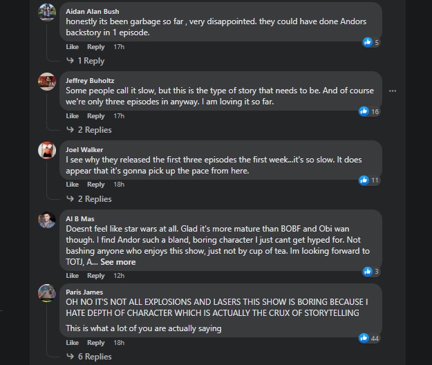 The comments above are just a smattering from the Star Wars Facebook post about the Andor series. One commenter even goes so far as to call the show “garbage.” Another deems it “forgettable.” Still, others are loving it and watching it with a completely different perspective. Reading all the social media comments makes me question whether many fans are capable of accepting something different at this point. Perhaps it’s not the content that’s dividing the fan base, but complacency.