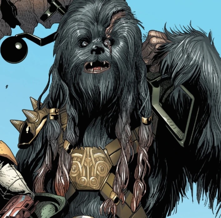 Fans familiar with the greater Star Wars universe beyond the films immediately recognized the wookiee gladiator/bounty hunter the moment he appeared on screen. Black Krrsantan first appeared in the Darth Vader series from Marvel Comics. He features heavily there, as well as in the corresponding Doctor Aphra series. A close look at the character in The Book of Boba Fett hints that we might just see some of the disgraced wookiee’s comic book story on screen.