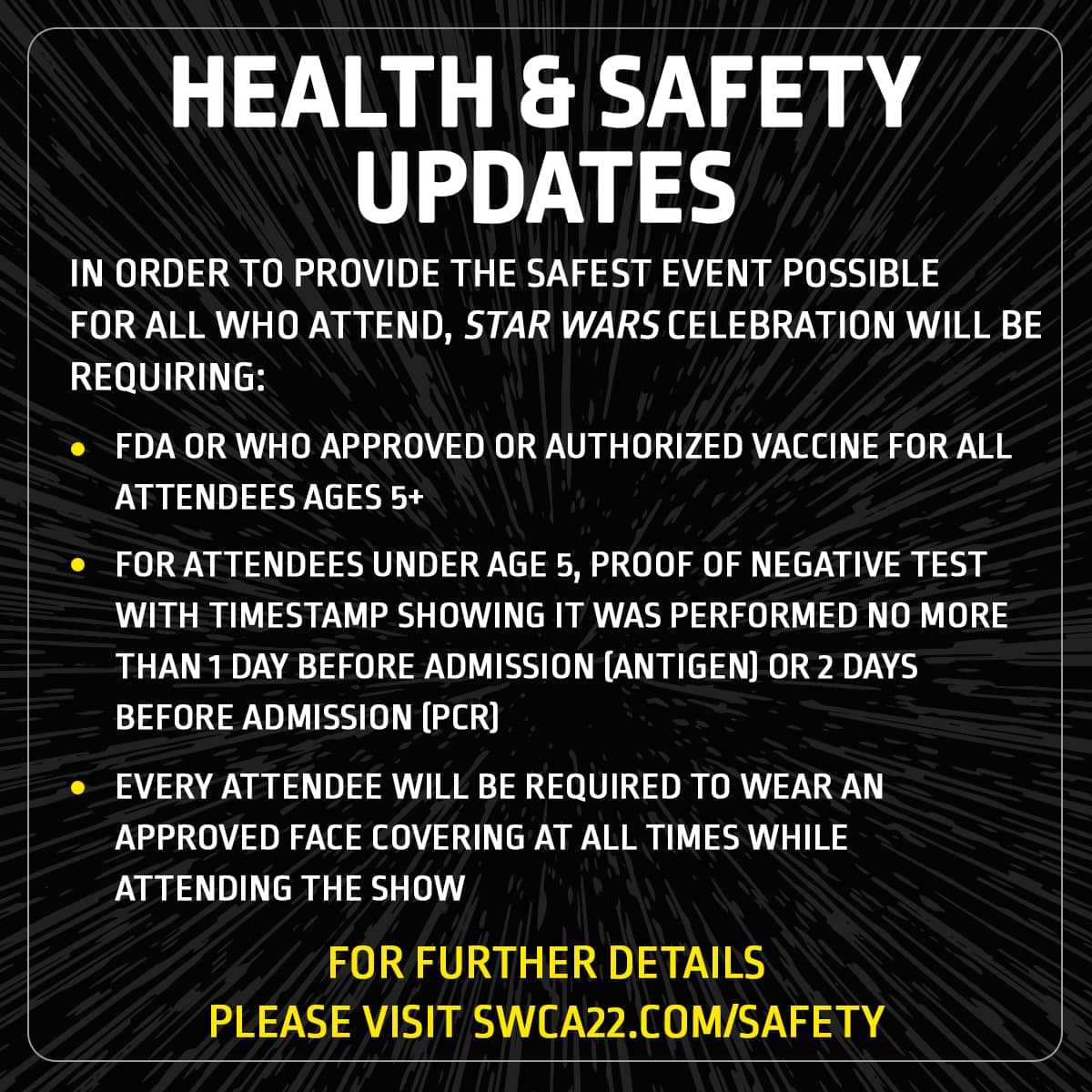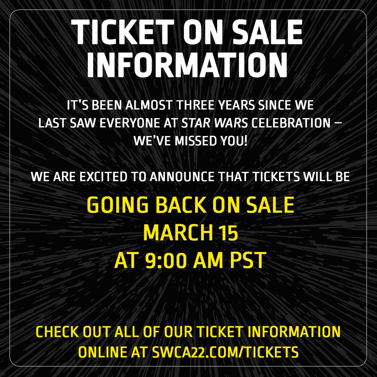Ticket Availability and Important Show Updates are here! Tickets will be going back on sale to the general public for Star Wars Celebration 2022 on March 15 at 9:00 AM PT. Mark your calendar as tickets will be limited and certain types may sell out quickly! Details are available at SWCA22.com/Tickets. In order to provide the best and safest fan experience possible, Star Wars Celebration 2022 will require proof of full vaccination for age 5+. Those under the age of 5 must present a lab-reported negative test. At home tests will not be accepted. Every attendee will be required to wear an approved face covering at all times while attending the show. For more details on Health & Safety, visit SWCA22.com/Safety
