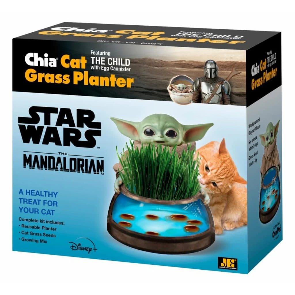The Star Wars: The Mandalorian Child with Egg Canister Chia Cat Grass Planter is a fun and easy way to grow a nutritious treat for your cat. Complete grass kit includes a reusable planter, cat grass seeds, and growing mix.