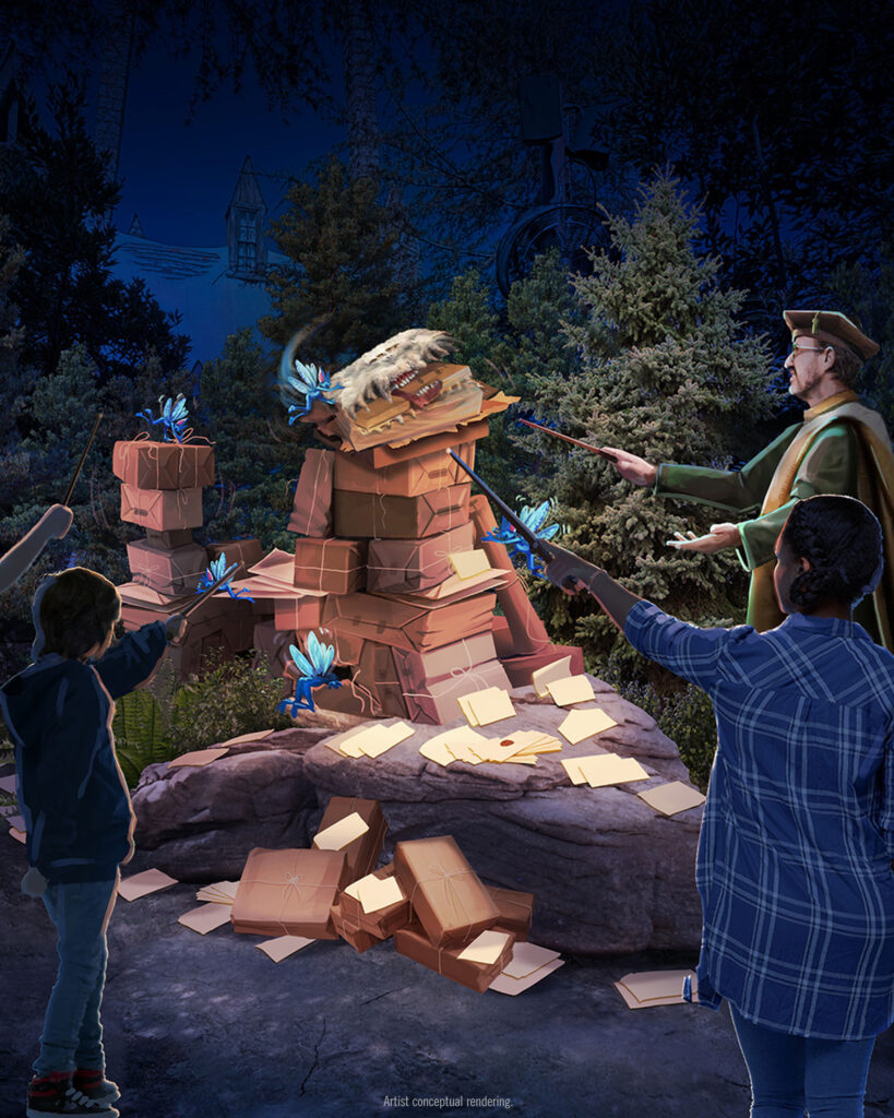 With guidance from a Hogwarts Magical Creatures professor, guests will embark on an exciting walk-through adventure within the Forbidden Forest where they will encounter an array of magical creatures and familiar beasts, from pixies to owls and spiders as well as the infamous Monster Book of Monsters, as they forge ahead on a daring nighttime mission. A series of obstacles will interrupt their journey, challenging them to summon their bravery and spellbinding skills in order to rescue the Hippogriff.