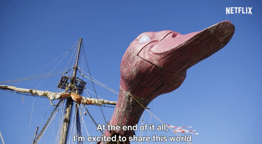 The biggest surprise of all though only lasts for a second. We actually get to see footage of what the Straw Hats’ Going Merry will look like in Netflix’s One Piece. As you can see above, the Going Merry looks a bit…different from what we see in canon. Most notably in the goat figurehead. The figurehead features the same semi-realistic cute yet disturbing design Miss Love Duck‘s figurehead has. Based on Baratie’s fish head bow, this seems to be an intentional design choice on Netflix’s part. Maybe the rest of Going Merry will compensate for that. Especially when Nami joins up, and starts growing her iconic tangerine trees on the poop deck.