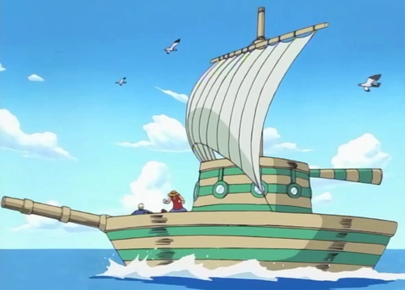 There is one last ship the One Piece: Set Sneak Peek video showed off though that I’m utterly baffled by. You can see it for yourself above. It doesn’t look like any ship in canon proper. I can only speculate that it’s the live-action version of Shimashima Island: the small ship Sanji owned and used to get himself, Luffy, and Zoro to Arlong Park. My reasoning for that? The yellow and green triangle pattern along with the ship. It matches the color scheme of Shimashima Island. You can see her below for comparison.