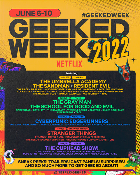 A day highlighting Netflix animation marks the midway point of Geeked Week. Look out for updates on Cyberpunk: Edgerunners, The Dragon Prince, Arcane, and more.